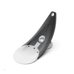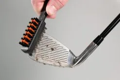 Unscrew the top and fill the bottle with water. After replacing the top, simply pull it upwards until you hear a ‘click’ and scrub the club with the nylon brush facing downward whilst at the same time squeezing the bottle enabling the water inside to flow through. The water bottle club cleaner also features a clip allowing it to be hung on a golf bag.