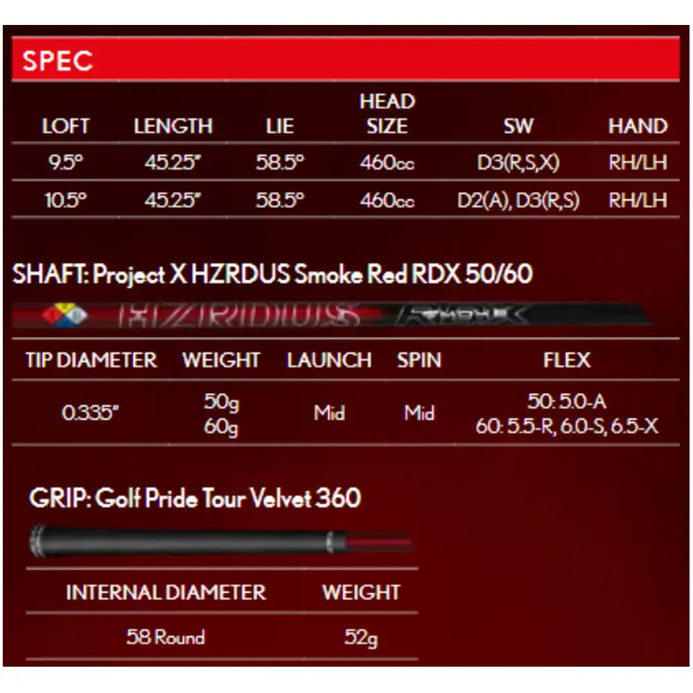 This drives as standard comes with a Hzrdus Red RDX Graphite Shaft and a Golf Pride Tour Velvet 360 grip.